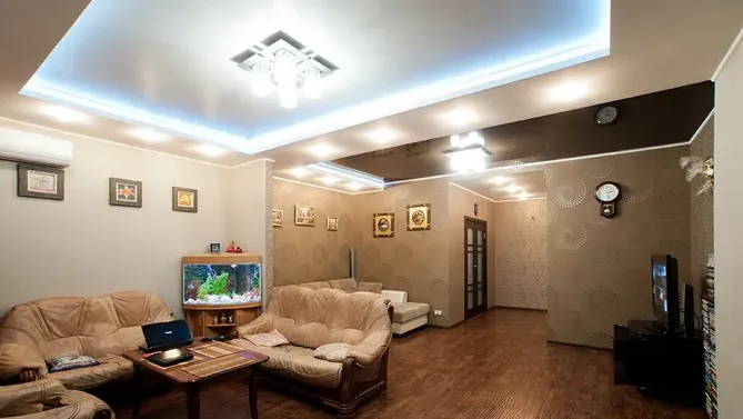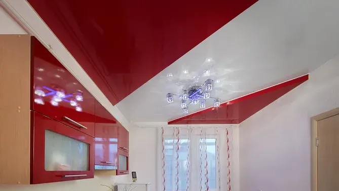 Ці стелі складаються з двох рівнів, що дозволяє створити відчуття об’ємності та глибини в приміщенні. Верхній рівень може бути виконаний в одному стилі, а нижній в будь-якому іншому (наприклад верх – матовий, а низ – глянець). Ці натяжні стелі дозволяють відмінно підійти для великих приміщень з високими стелями, таких як вестибюлі, конференц-зали, кінозали, бізнес-центри.